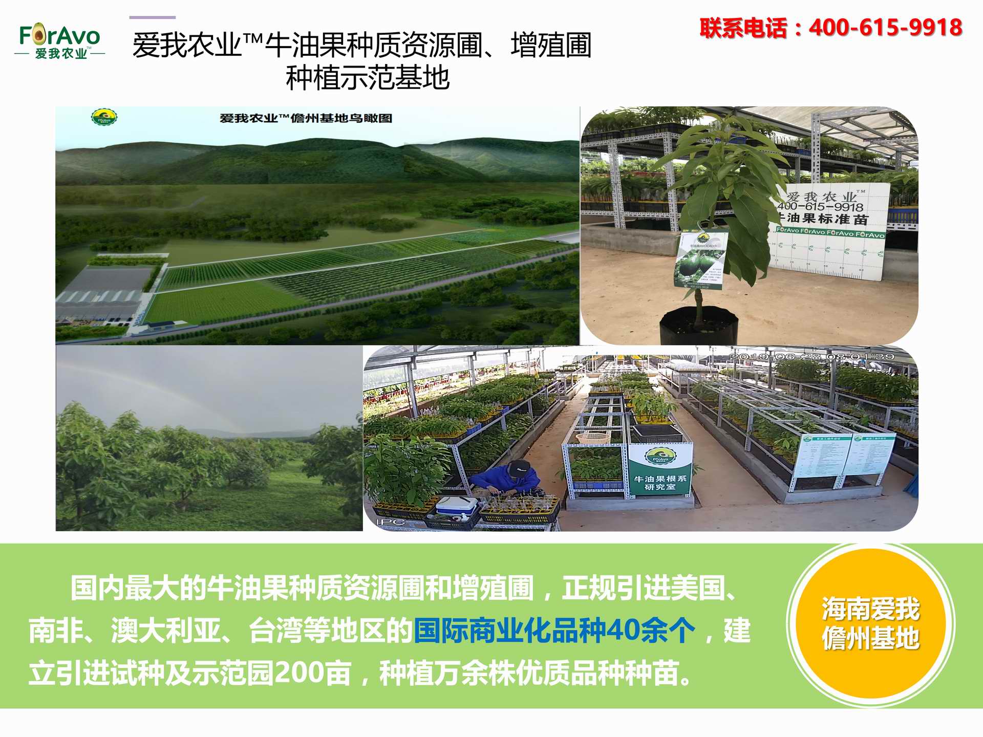 海南愛我農業科技有限公司是一家綜合性的高科技農業發展企業,旗下愛我農業TM致力于打造中國最大最強的牛油果種植企業。依托美國、南非、澳大利亞等擁有百年牛油果繁育、種植歷史以及產業鏈市場的優勢,開展牛油果種苗繁育、種植技術,種植加盟、深加工等產業。結合中國市場,面向廣大苗圃基地、種植農場、合作加工等企業,推出的適合規模化、標準化的牛油果全產業鏈服務。 Hainan Foravo Agricultural Technology Co., Ltd. is a comprehensive high-tech agricultural development enterprise , dedicated to building the largest and most powerful avocado plantation enterprise in China. Relying on the advantage of avocado nursery, planting history, and the industrial chain over 100 years in the United States, South Africa, Australia, we are carrying out nursery, planting, proce...